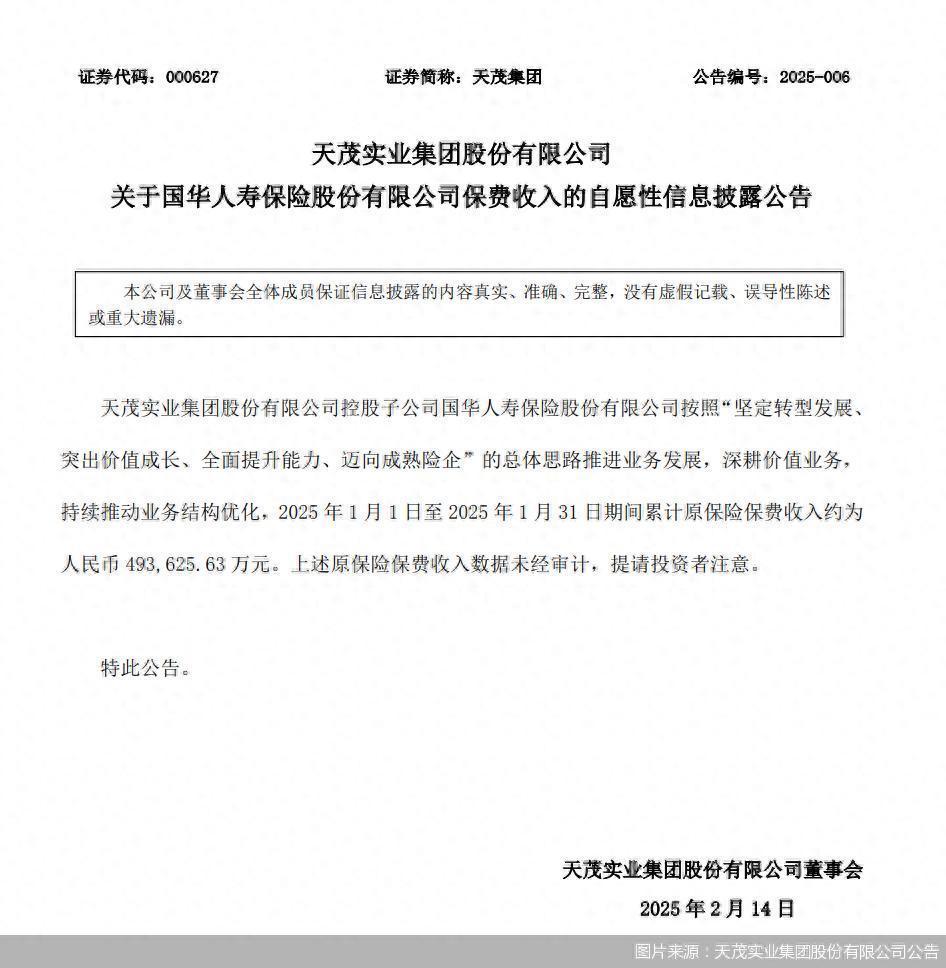 北京商报讯(记者 李秀梅)2月14日,天茂实业集团股份有限公司公告,其控股子公司国华人寿保险股份有限公司2025年1月1日至2025年1月31日期间累计原保险保费收入约为人民币49.36亿元。